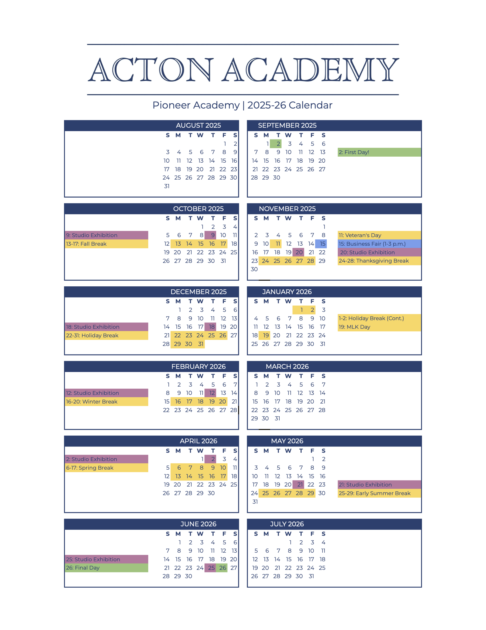 Our calendar school year is designed to support learners and their families to get the most out of their learning journey at Pioneer Acton Academy.